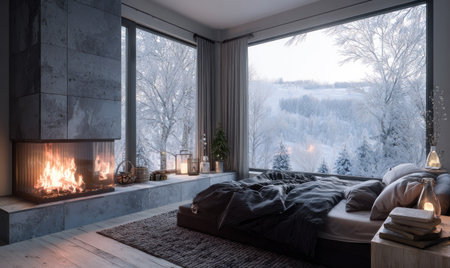 A modern bedroom features a burning fireplace and a large window showcasing a snowy landscape. The scene displays neutral tones with warm lighting. This image could be used in advertising materials, design projects or to illustrate themes of comfort and nature. It evokes serenity.