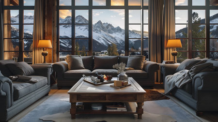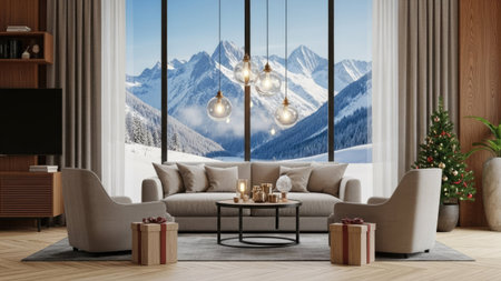 An inviting interior showcases a living room with a clear view of snow-capped mountains. A sofa and chairs are arranged around a small table, with soft lighting and a neutral color palette. The scene includes gift boxes, suggesting a festive or special occasion, and is suitable for various commercial uses.