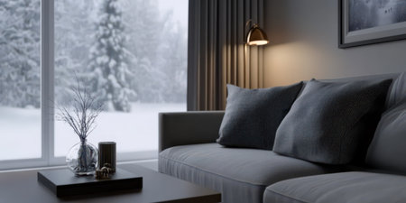 Interior of a cozy living room with a big window in winter