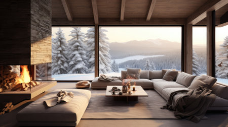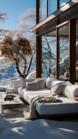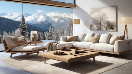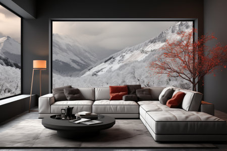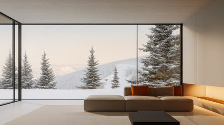Modern living room with mountain view during winter season