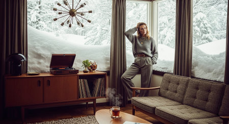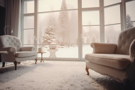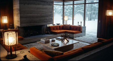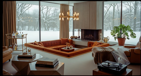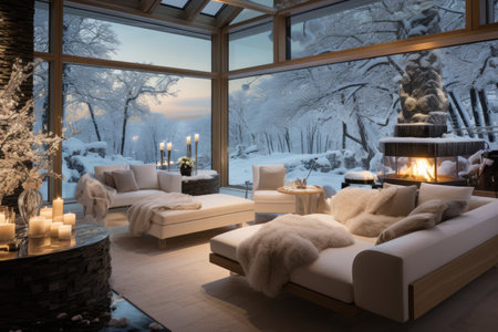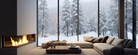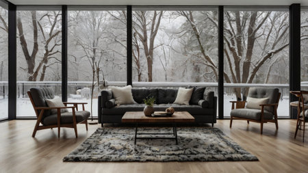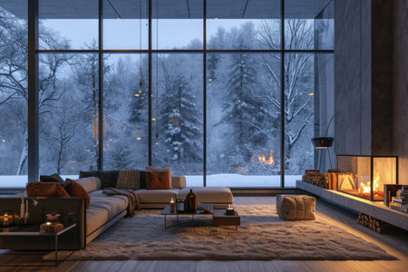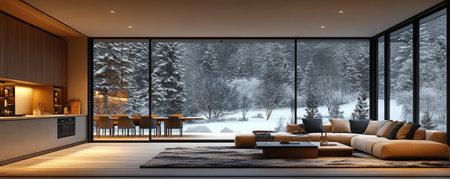 Cozy modern room with large windows and views of the winter landscape