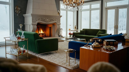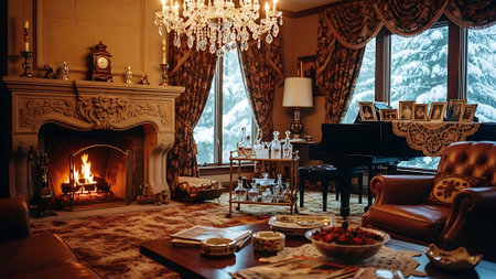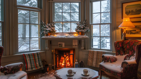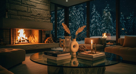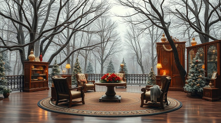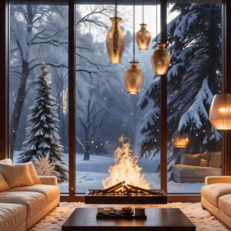 A cozy winter living room captures the essence of holiday spirit with decorations, snow-covered trees outside, and a warm atmosphere perfect for relaxation.