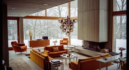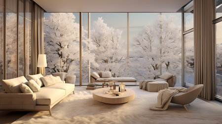 Luxury living room with winter landscape view.