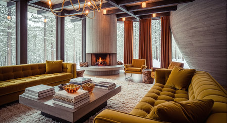 A cozy modern living room with large windows overlooking a snowy landscape, featuring yellow sofas, a circular fireplace, and warm lighting