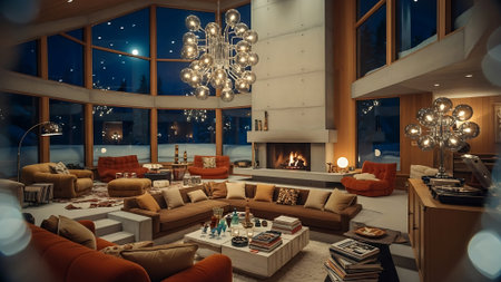 Interior of a modern living room at night in the mountains.