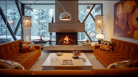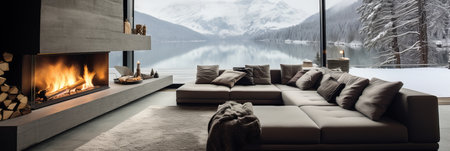 Modern living room interior with a burning fireplace and a snowy mountain view