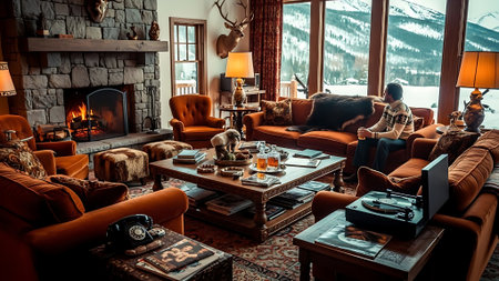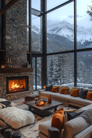 Interior of a cozy living room with a fireplace in the mountains
