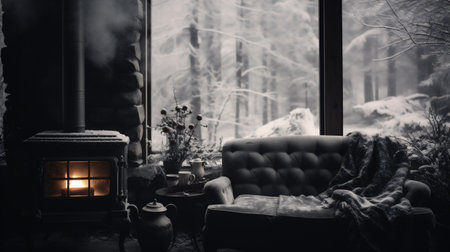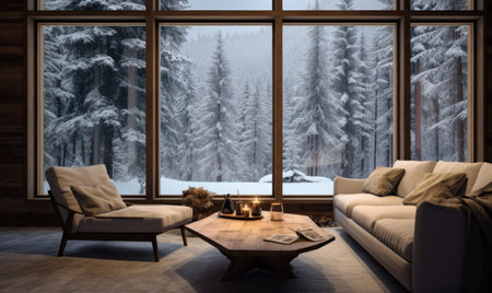 Interior of a cozy living room with a large window overlooking the winter forest