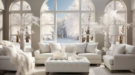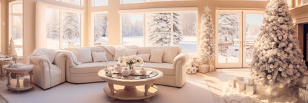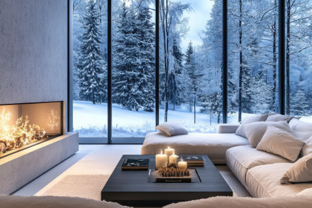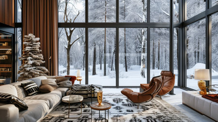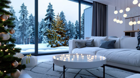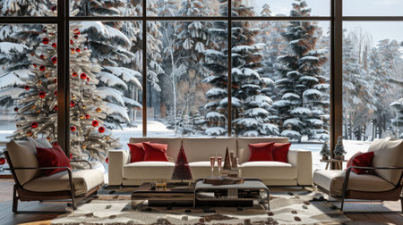 An elegant living room complemented by Christmas decor, showcasing a snowy forest view through large windows, capturing a cozy winter holiday atmosphere concept