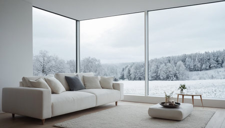 A bright, modern living room a large corner window showcasing a snow-covered forest. A plush white sofa and ottoman create a cozy, minimalist space.