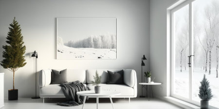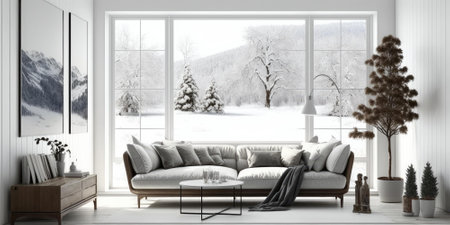 a beautiful snow-covered landscape outside the panoramic window and a sofa standing in front of the window, Generative AI