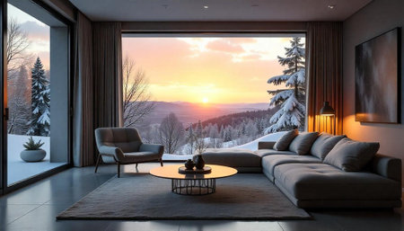 Modern Living Room with Winter Mountain Sunset View