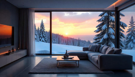 A cozy living room features a large window showcasing a tranquil winter landscape with snow-covered trees and distant mountains during the early morning light.