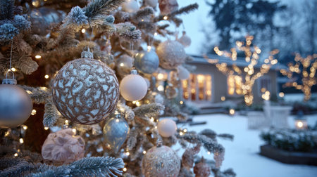 A beautifully decorated Christmas tree adorned with frosted ornaments and twinkling lights, set in a tranquil winter landscape, creates a warm holiday atmosphere.
