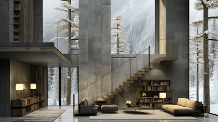Modern cozy living room interior with a large window overlooking the winter forest.