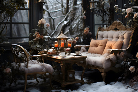 Beautiful winter terrace with candles and flowers in the garden.