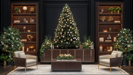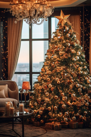 Luxurious Hotel Suite Decorated for the Holidays with Opulent Christmas Tree and Fireplace in Elegant Setting. Concept of Festive Ambiance, Cozy Winter Evenings, Elegant Celebrations.