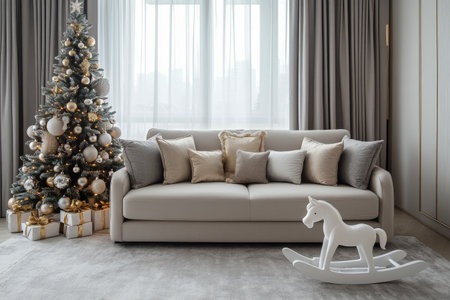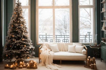 Christmas decorated interior of couch and Christmas tree, modern and cozy
