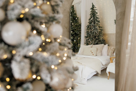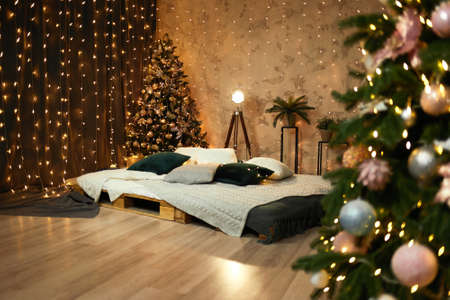 Banner cozy bedroom with Christmas wreath and blurred decorated tree with warm lights