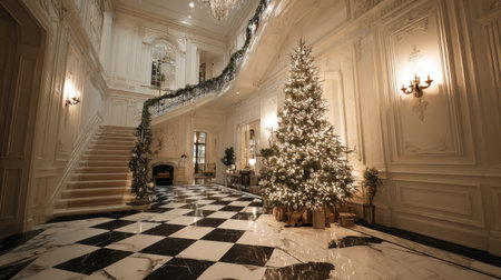 This stunning interior scene showcases a luxury foyer adorned with a beautifully decorated Christmas tree, featuring an elegant marble floor and grand staircase.