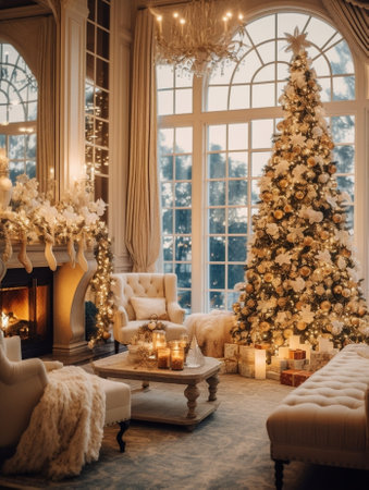 Luxurious living room with holiday decorations and a fireplace for the Christmas season. Concepts of festive home decor, holiday warmth, Christmas celebration.