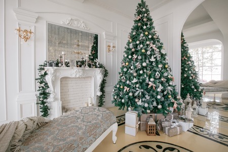 Beautiful Christmas tree in the living room with fireplace and christmas gifts