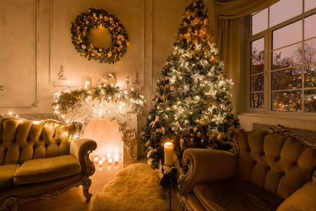 Christmas evening by candlelight. classic apartments with a white fireplace, decorated tree, sofa, large windows and chandelier.