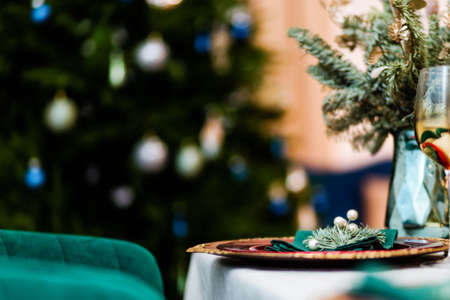 New Year table setting. On the table there are golden and red plates with a napkin, a glass and a vase with Christmas tree branches. Photo