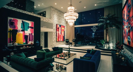 A modern living room with colorful sofas, elegant decor, and a stylish bar area, featuring artwork on the walls and a large chandelier overhead