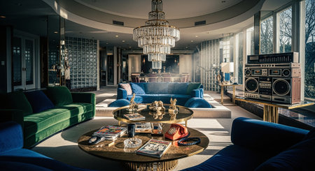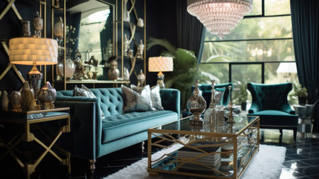 Living room decor, home interior design . Art Deco Glamorous style with Chandelier decorated with Velvet and Marble material . Generative AI AIG26.
