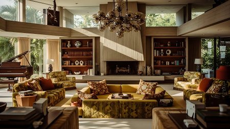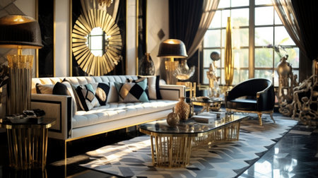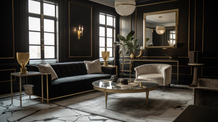 Interior design of Living Room in Art Deco style with Art decorated with Velvet, Brass, Marble material. Historic architecture. Generative AI AIG24.