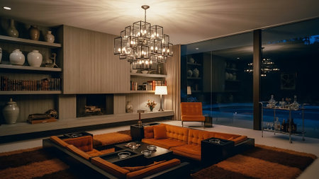 Luxury living room interior design. Night scene. 3D rendering.