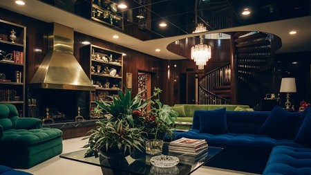 Interior of modern living room with furniture and plants, vintage style