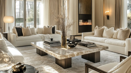 A luxurious minimalist living room with a marble coffee table, elegant neutral-toned furniture, and modern lighting.