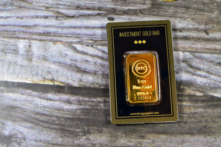 Cairo, Egypt, December 8 2023: 24K karat BTC Bullion Trading Center pure yellow gold Ounce 1 OZ 31.1 grams bar, gold investment, exchange price rate, inflation crisis and saving money assets concept