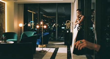 Beautiful young woman in evening dress standing in luxury hotel room.