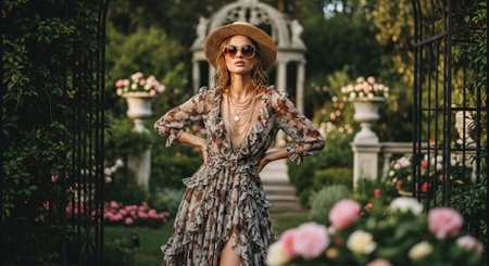 Beautiful young woman in a hat and dress in the park.