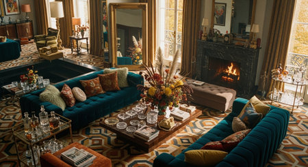 Elegant living room interior with blue walls and luxury accents