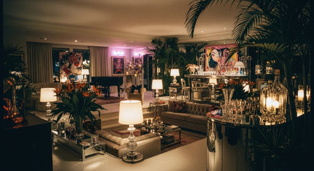 A spacious and stylish living room featuring modern furniture, large windows, and elegant chandeliers, with a mix of colorful decor and greenery