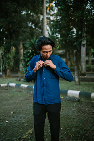 Young Asian man buttoning up his shirt outdoor. Concept of getting ready and preparing for a new day in a casual style.