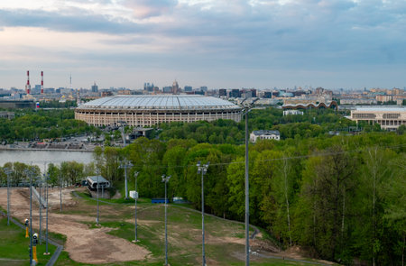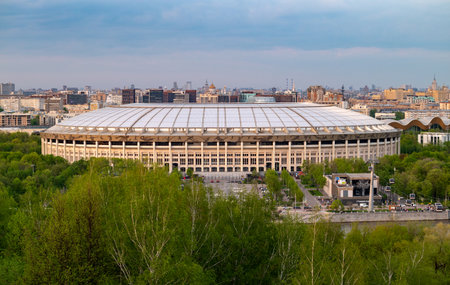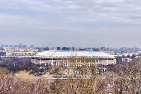 View of Grand Sports Arena of Luzhniki Olympic Complex, national stadium of Russia, located in its capital city, Moscow, from observation deck on Sparrow hills. Spring cityscape.
