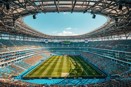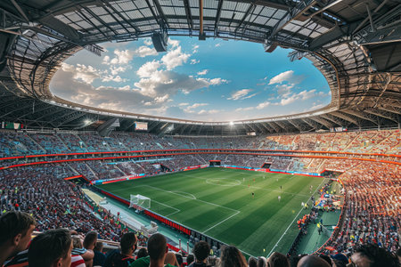 A bustling stadium filled with enthusiastic fans watching a soccer game on the field. Generative AI