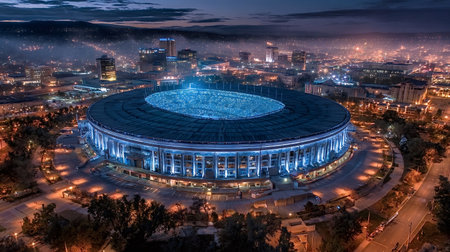 Illuminated olympic stadium in kiev, ukraine, glowing against the city skyline at dusk, highlighting the vibrant urban landscape and stunning architecture