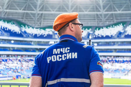 Samara, Russia - May 16, 2018: Russian emercom officer in uniform standing in the cordon against the background of the stadium. Text on russian: MOE RUSSIA