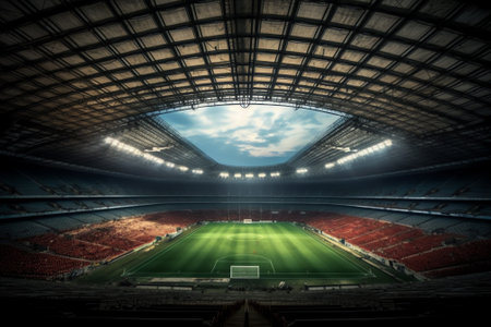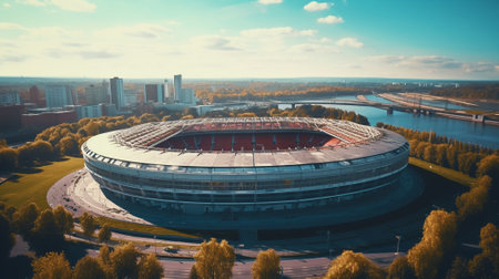 Aerial view of grand stadium aglow with sunset, embodying energy passion atmosphere of sports competitions, tournaments ready to welcome throngs of passionate fans and thrilling clash of athletes