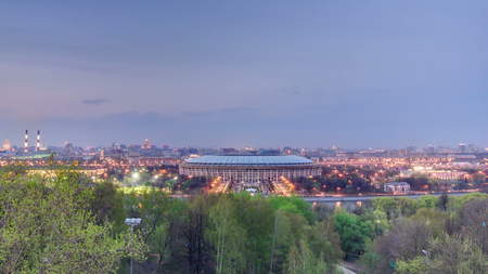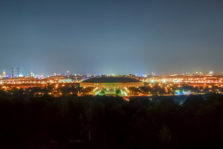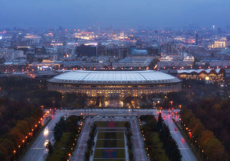Aerial view of Luzhniki Stadium and complex from Sparrow Hills, Moscow, Russia at night.