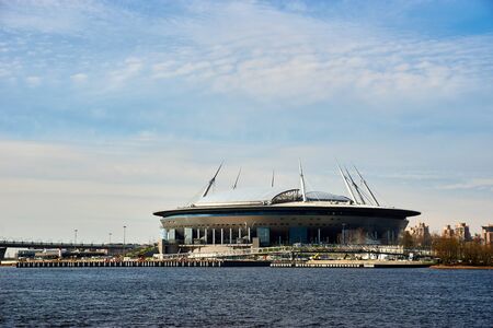 SAINT-PETERSBURG, RUSSIA - MAY 7: Krestovsky or St.Petersburg football stadum . View from water on FC Zenit or FIFA World Cup 2018 stadium on MAY 7, 2018 in Saint-Petersburg, Russia
