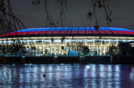 MOSCOW, RUSSIA - DECEMBER, 2017: Luzhniki stadium in Moscow during blue hour in the evening. 2018 FIFA World Cup final game stadium.