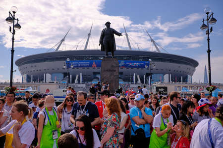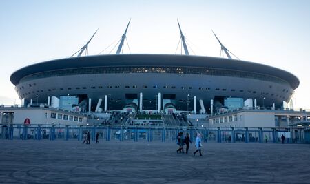 St. Petersburg, Russia - July 10, 2018: View of the Stadium and the Yacht Bridge with people walking before a football match in St. Petersburg