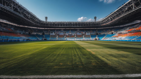 Symmetrical shot from behind one goal, stadium adorned for final match, calm and anticipation